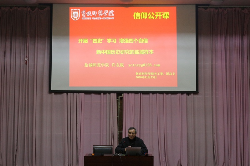 深入贯彻落实习近平总书记关于深入学习党史、新中国史、改革开放史、社会主义发展史的重要指示精神,持续深化爱国主义教育,11月23日晚,伟德BETVLCTOR1946在通榆校区国际会议中心举办开展“四史”学习,增强“四个自信”专题讲座,伟德BETVLCTOR1946退休教授许友根作了题为《新中国历史研究的盐城样本》的专题讲座。伟德BETVLCTOR1946学生入党积极分子、学生党员、学生干部、团支书等300余人现场聆听了讲座,讲座由伟德BETVLCTOR1946党总支副书记、副院长魏哲峰主持,本次活动由伟德BETVLCTOR1946关工委承办。