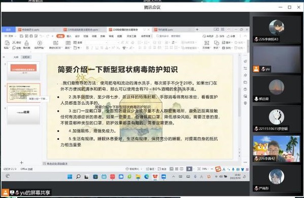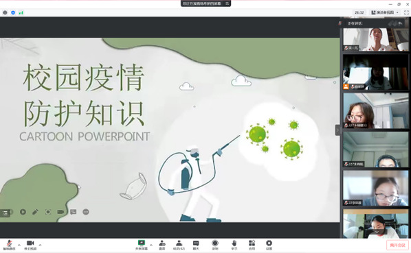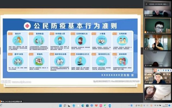 线上主题班会在各班主持人的引导下有条不紊地进行着,22(3)班的同学们认真地在屏幕前聆听关于疫情防控知识的宣讲,主持人重点强调了《公民防疫行为准则》的要求,叮嘱各位同学在校期间认真遵守行为准则,不给自己以及他人添麻烦.全体同学万众一心,共同筑起防疫的坚固“围墙”。“疫情就是命令,防控就是责任。”疫情期间有许多大学生志愿者奔赴一线,为社会奉献自己的一份力量。22(2)班的主持人向同学们分享了几例大学生先进事例,在瀍河区民族路一小区入口,“00”后准大学生志愿者刘启龙正在对进入小区的居民群众进行体温检测。闲在家里的他想为疫情防控做些事情,就抱着试一试的心态向社区报了名。顶烈日、冒酷暑,虽然工作很累,但他没有丝毫抱怨。以青春的名义积极贡献自己的力量,我们要以刘启龙为代表的先进大学生们为榜样,不畏惧困难,勇敢向前,向社会展示青少年一代的责任与担当。